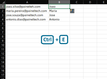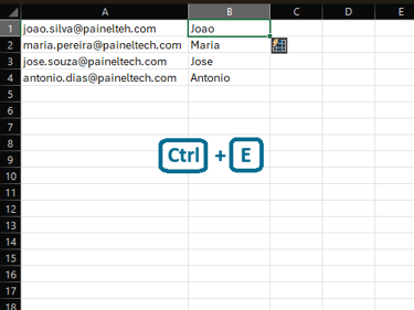 Se você tem uma lista de e-mails (ex.: joao.silva@email.com) e digita apenas o primeiro nome, o Flash Fill preenche o resto da coluna automaticamente.
